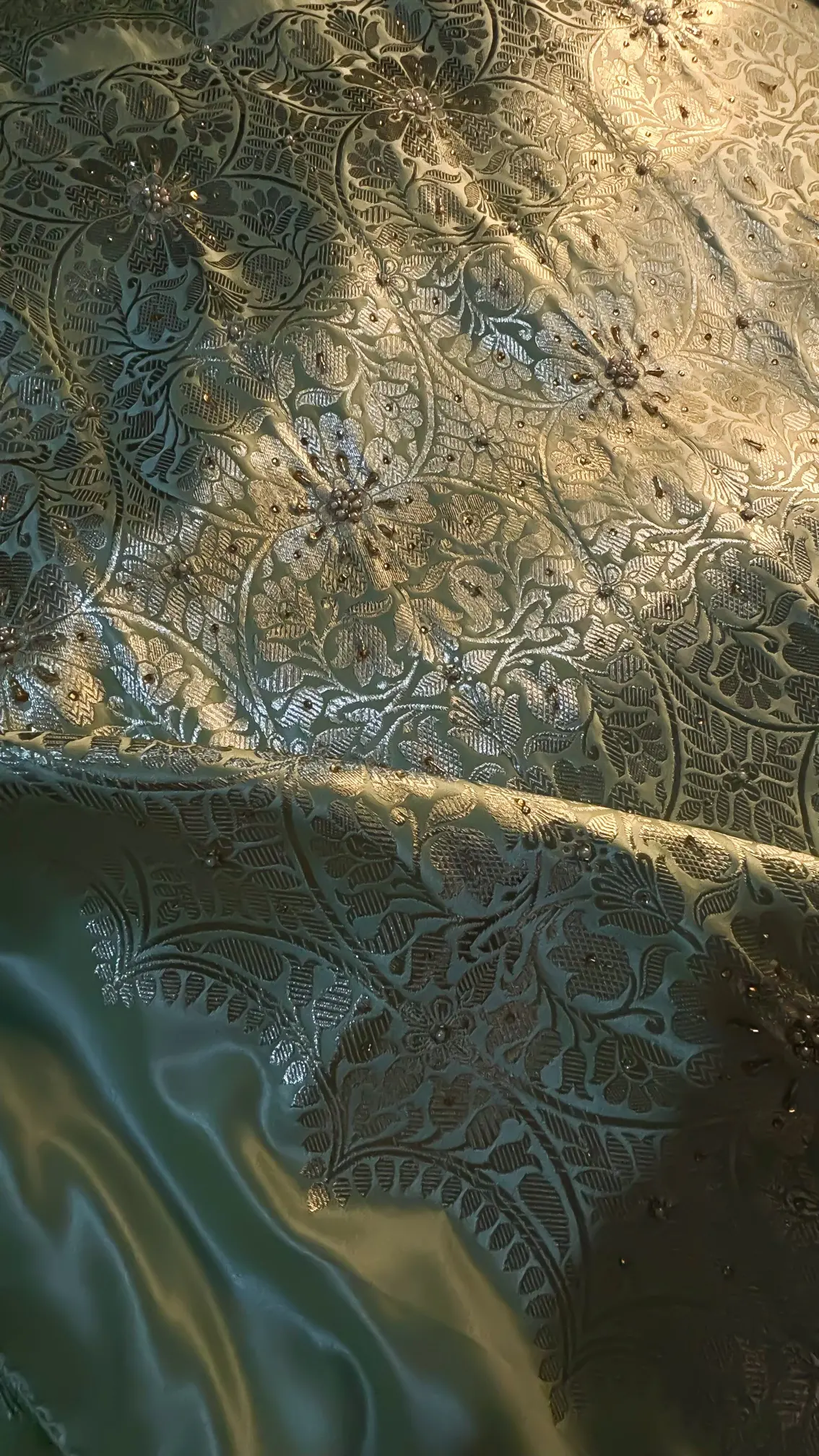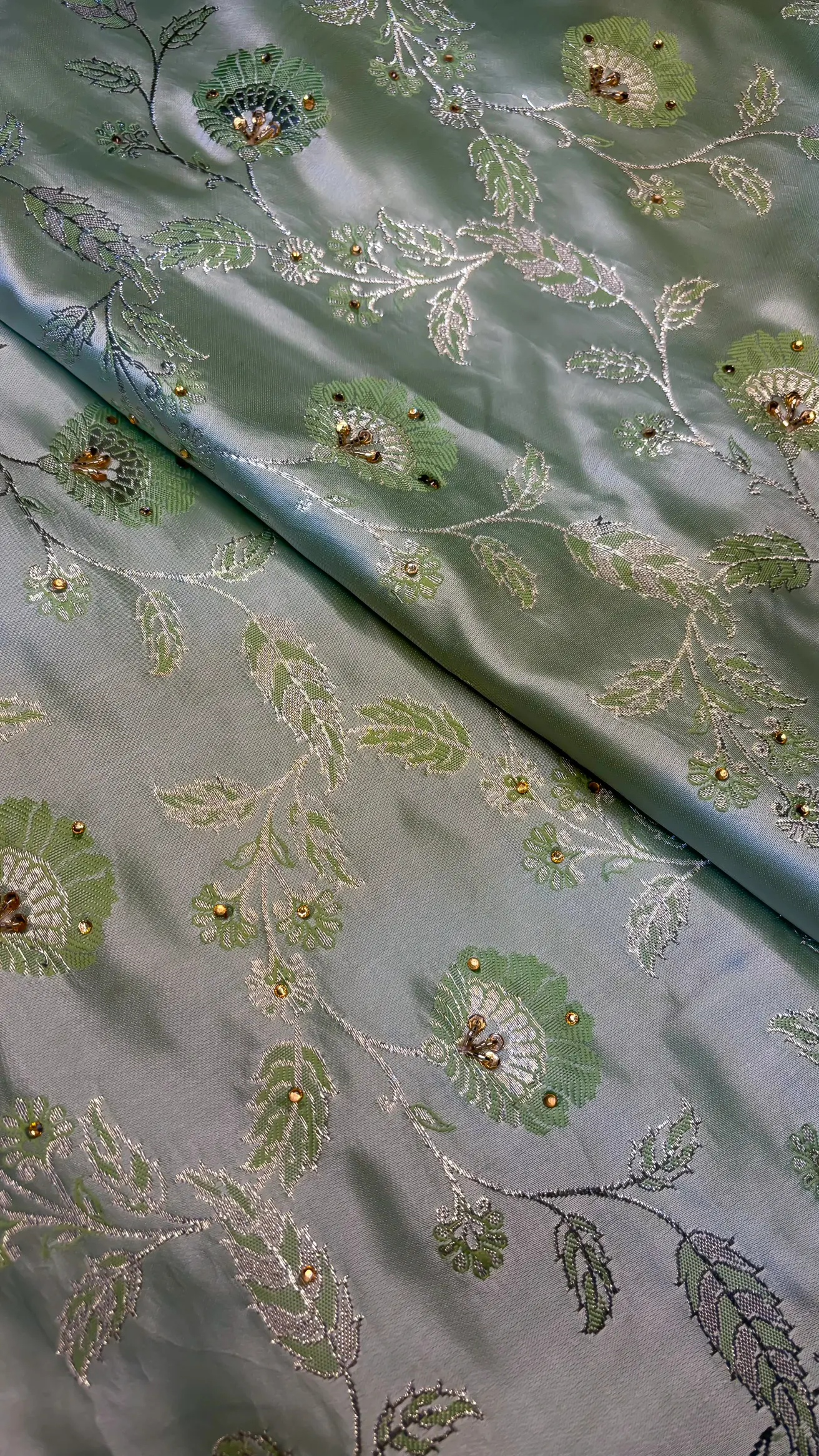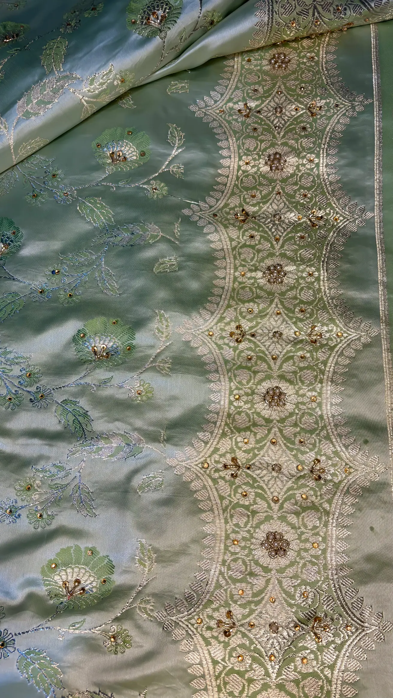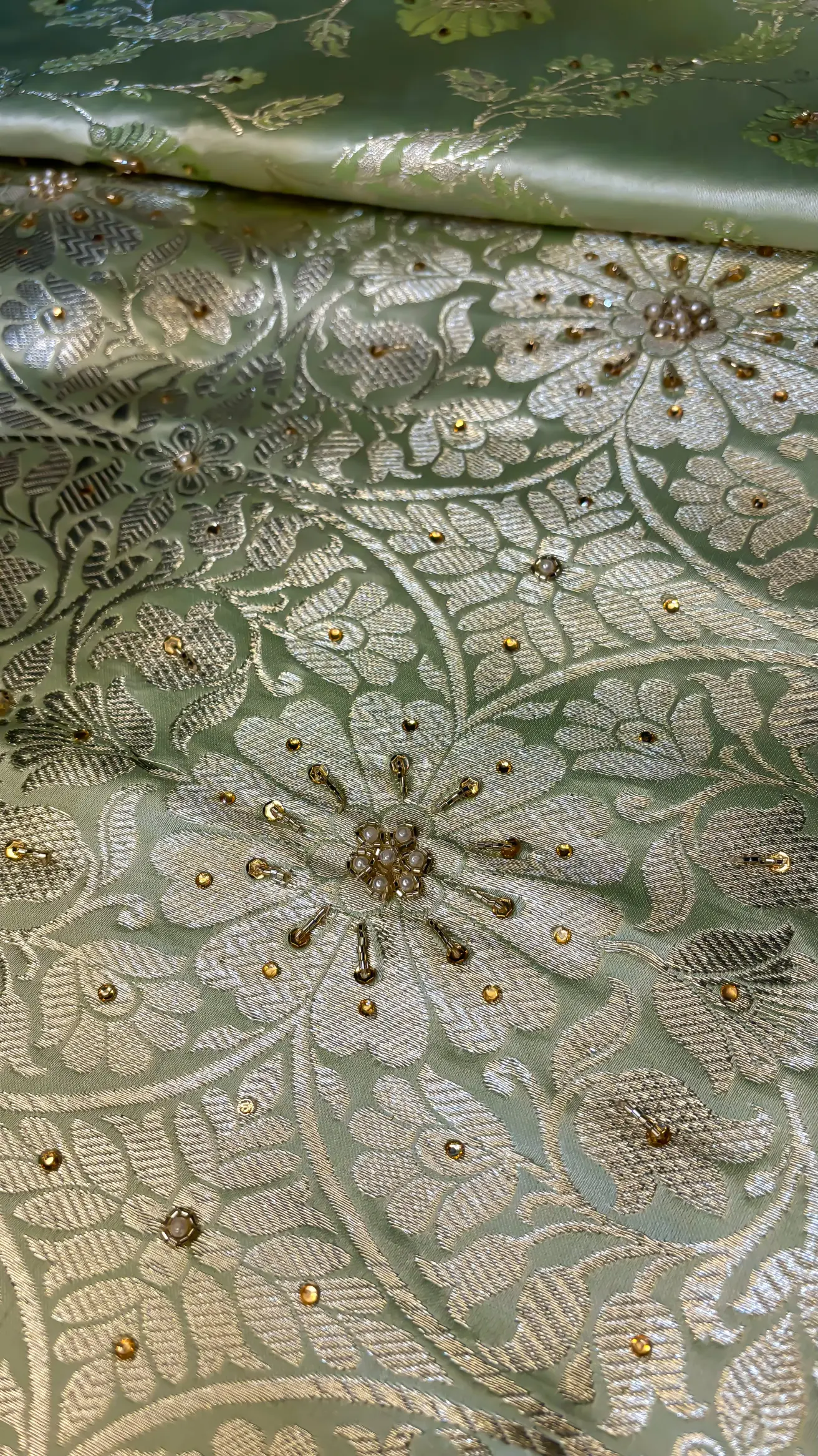 | Content | Fabric: Premium silk adorned with stones, aari and Zardozi embroideryColor: Celestial Pistachio – a soft pastel green with shimmering gold accentsHandwork Details: Luxurious Zardozi metallic threadwork, intricate aari stitching, and sparkling stones |