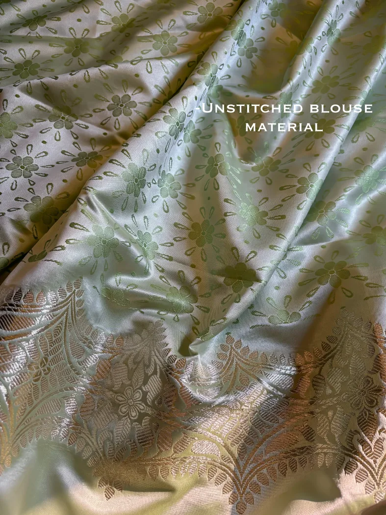 The ethereal Celestial Pistachio shade enhanced by handwoven embellishments reflects grace, sophistication, and heritage. Pair it with minimalist gold or kundan jewelry to let the craftsmanship shine in all its glory.