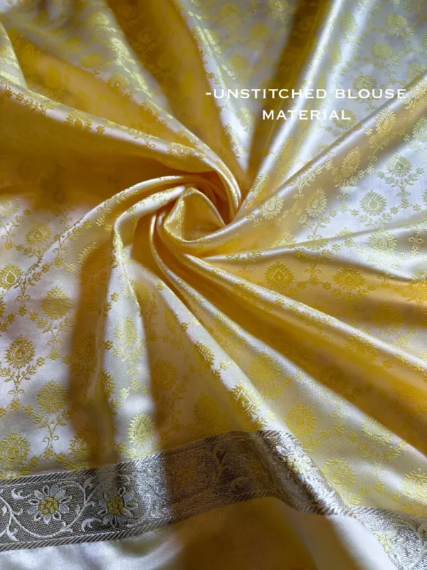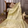 The golden hue, enhanced by lavish handwoven embellishments, evokes timeless grace and regal sophistication. Pair with antique gold or pearl jewelry to complete a look that is both classic and captivating.