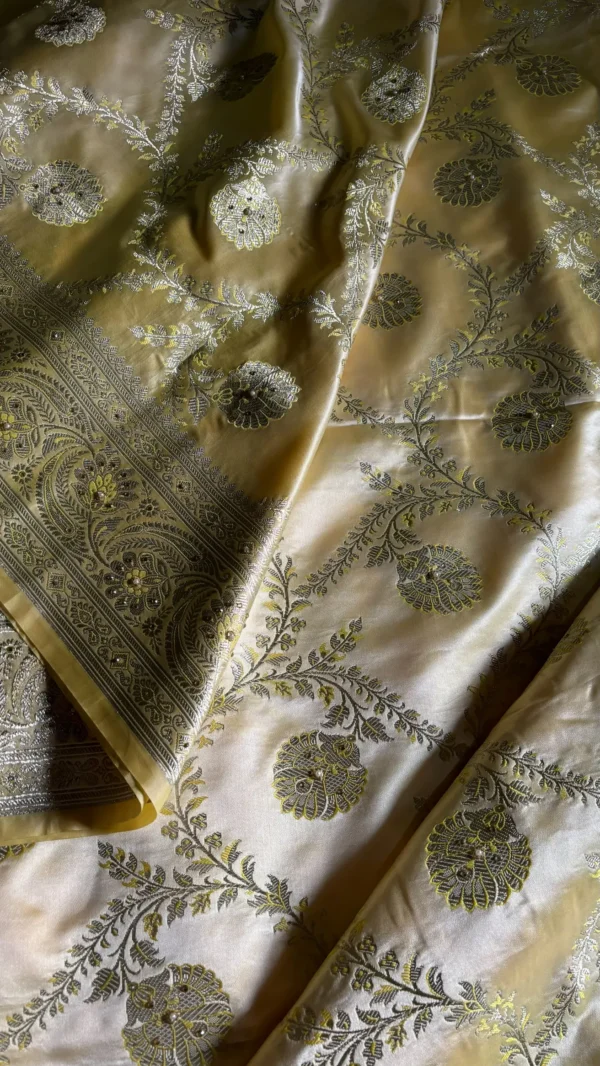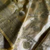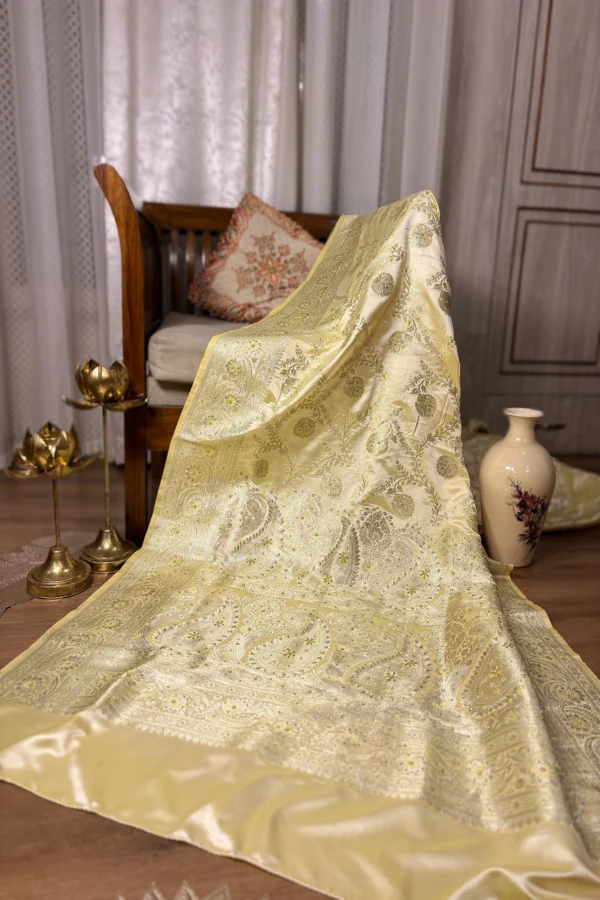 Each paisley and floral motif across the pallu and border is meticulously handcrafted by skilled artisans, combining centuries-old Indian embroidery techniques to create an elegant texture and depth. Kanakprabha is perfect for weddings, festive occasions, and grand ceremonies where every detail matters and sparkling luxury is desired.
