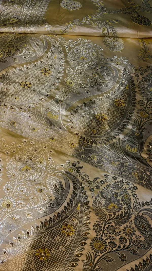 | Content | Fabric: Premium silk embroidered with zardozi, aari, and embellished with stonesColor: Luminous GoldenHandwork Details: Ornate paisley and floral patterns, detailed zari borders |