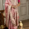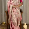 Immerse yourself in the timeless grace of Padmapriya (पद्मप्रिया), a baby pink silk saree that radiates royal elegance and artisanal mastery. The luxurious silk base shimmers with delicate golden zari, antique silver Zardozi, and intricate aari embroidery, accented with sparkling stones, creating a look of sublime sophistication.