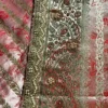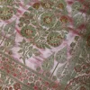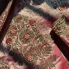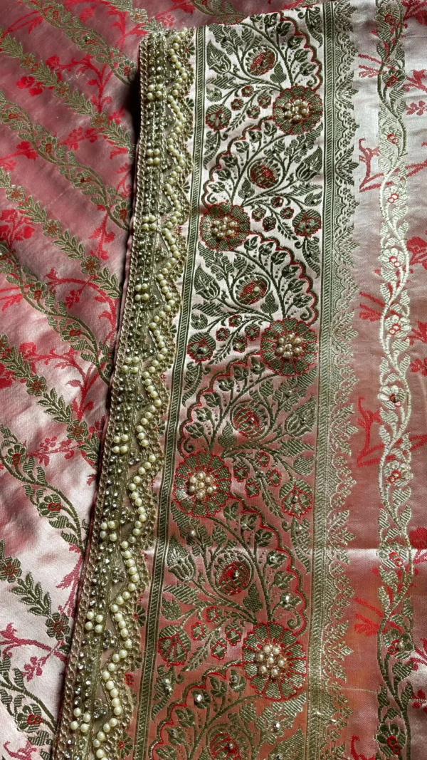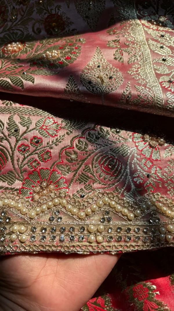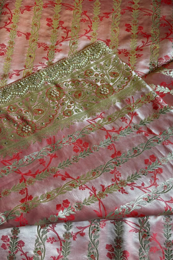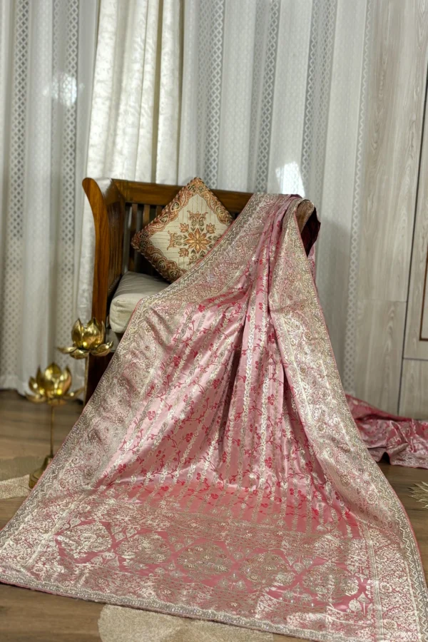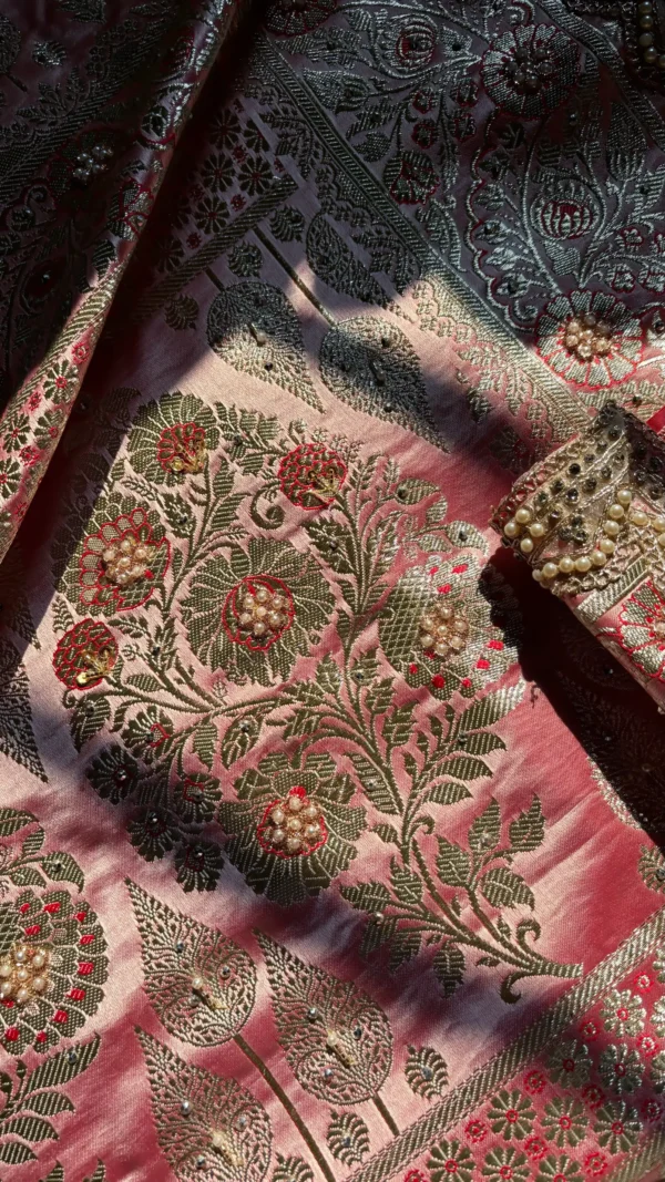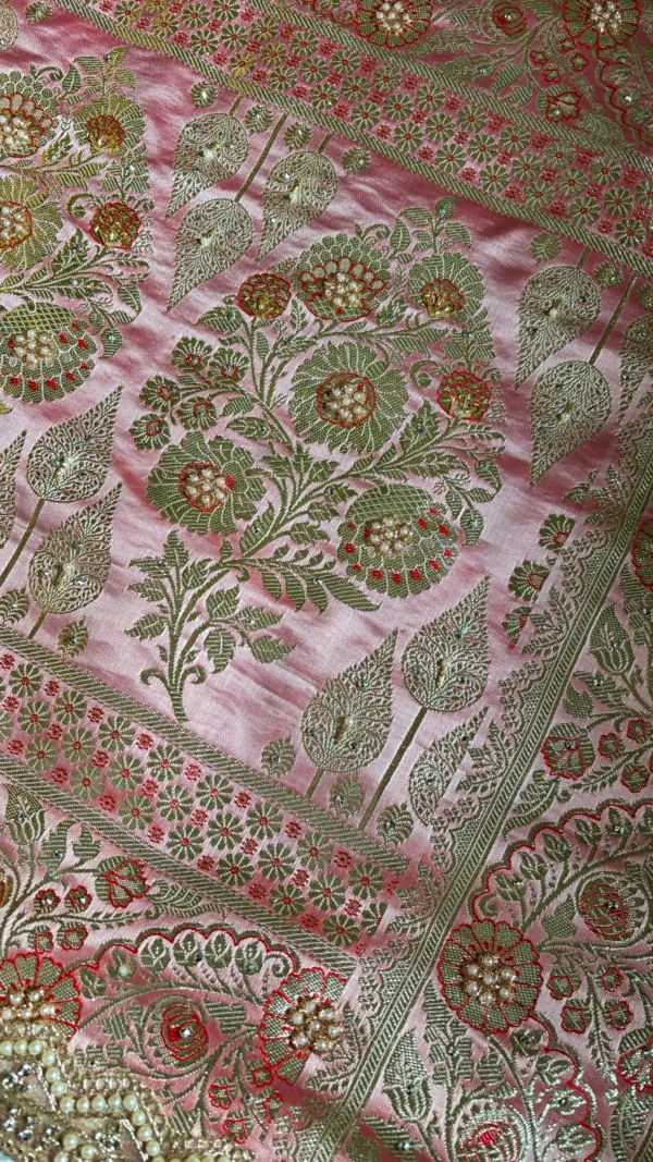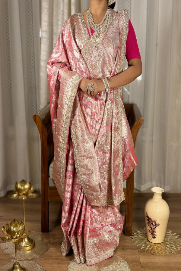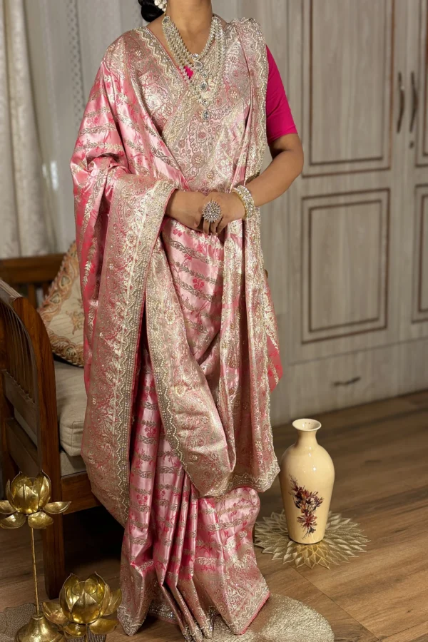 | Content | Fabric: Finest baby pink silk with radiant golden zari, antique silver Zardozi, aari embroidery, and sparkling stones Color: Gentle baby pink with shimmering gold accents Handwork Details: Floral and paisley motifs with richly woven golden zari borders and pallu |