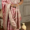 Immerse yourself in the timeless grace of Padmapriya (पद्मप्रिया), a baby pink silk saree that radiates royal elegance and artisanal mastery. The luxurious silk base shimmers with delicate golden zari, antique silver Zardozi, and intricate aari embroidery, accented with sparkling stones, creating a look of sublime sophistication.