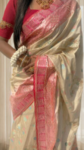 | Content | Fabric: Pure silk with golden zari, zardozi, and intricate aari hand embroidery. Colour Triple-tone pink blend featuring rosebud cherry, mulberry, and deep blush, highlighted with luminous gold accents. Handwork Details: Floral and paisley motifs handcrafted with zari, zardozi, and aari embroidery, finished with richly woven zari borders and an elaborately worked pallu. |